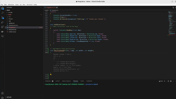 To show the next part, I will move the GetDirection and PositionFood methods to a separate class: GameControl. In my code, I intentionally left a few spots that are not fully completed. For the demonstration of the next scenario, I will open two tabs in VS Code, place the cursor where I need to add a few lines, and Copilot will suggest how to complete them. So, let’s take a look at the result.
