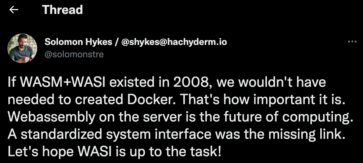 It’s no wonder Solomon Hykes (founder of Docker) famously said: “If WASM+WASI existed in 2008, we wouldn’t have needed to create Docker. That’s how important it is. WebAssembly on the server is the future of computing.”